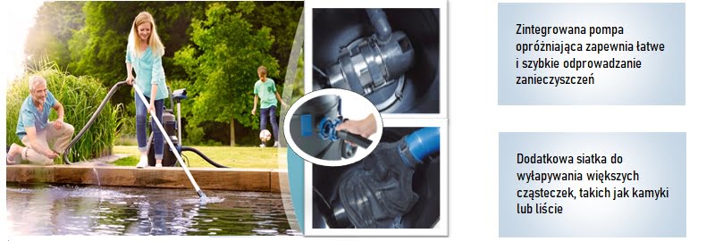 - Zastosowanie w oczkach wodnych, basenach oraz stawach kąpielowych, jak również z funkcją odkurzania na mokro wewnątrz pomieszczeń