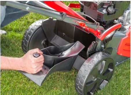 Większość kosiarek spalinowych, nawet tych z koszem, posiada opcję mielenia. Na powyższym zdjęciu znajduje się wkładka mieląca, którą wkłada się w kanał wyrzutowy bez użycia narzędzi. Wystarczy, że zdejmiesz kosz, podniesiesz klapkę i wsuniesz zaślepkę do kanału, przez który leci trawa do kosza.