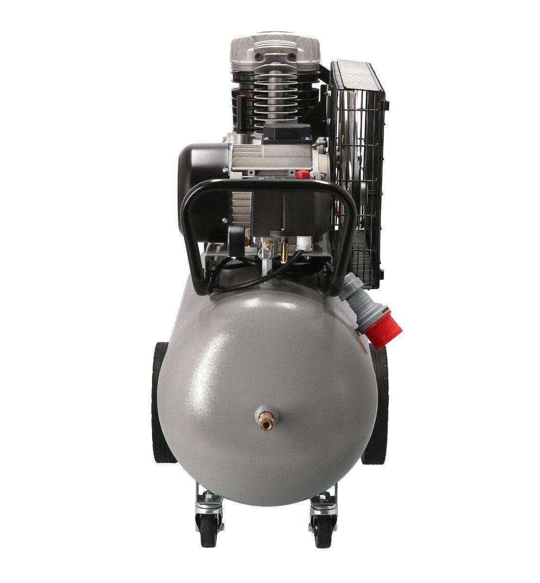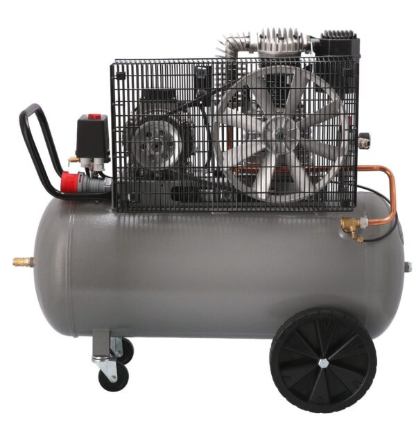 Duży zbiornik o pojemności 100 litrów pozwala utrzymać stabilne ciśnienie powietrza nawet przy większym zapotrzebowaniu. Koła transportowe ułatwiają przemieszczanie kompresora w miejscu pracy.