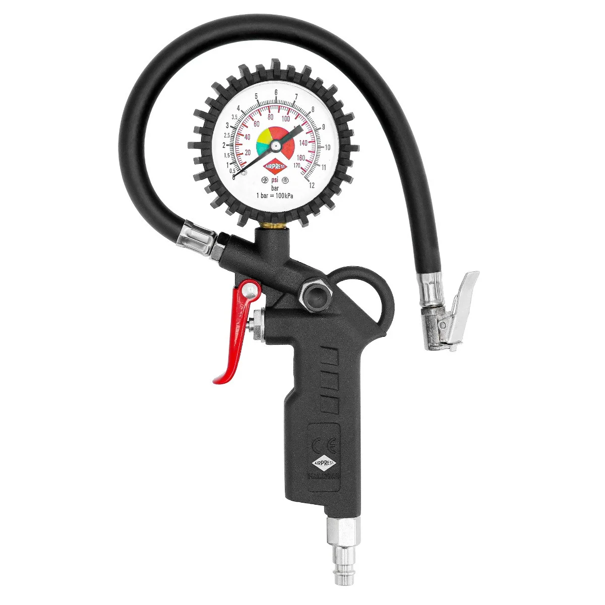 • W komplecie: Pistolet do przedmuchu, pistolet z manometrem (maks. ciśnienie 12 bar), końcówki do pompowania, wąż spiralny 3 m