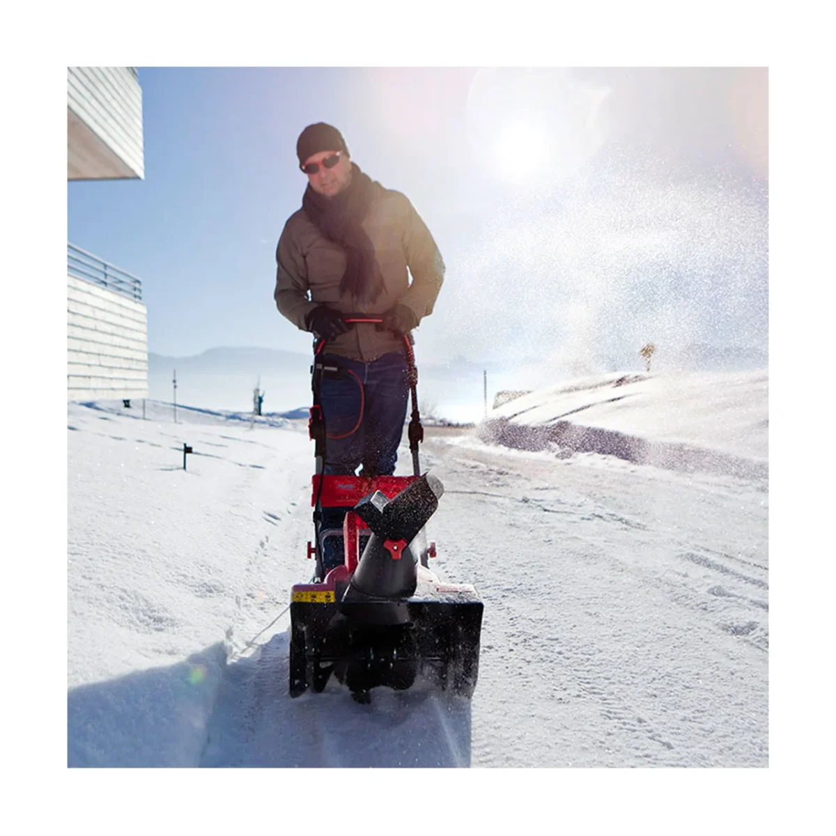 Łopatka zgarniająca, wykonana z mieszanki twardej gumy z osadzonym drutem stalowym, skutecznie zbiera śnieg. Ruchoma rynna wyrzutowa o zakresie 190 stopni umożliwia wyrzucanie śniegu na odległość do 10 metrów, dokładnie tam, gdzie tego potrzebujesz.