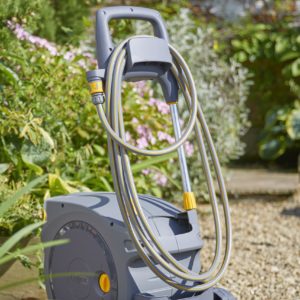 Wysokość uchwytu można regulować dla optymalnego komfortu. Schludnie przechowuj wąż zasilający, korzystając z punktów parkowania bez przecieków, idealnych do przechowywania Auto Reel Mobile w szopie lub garażu.