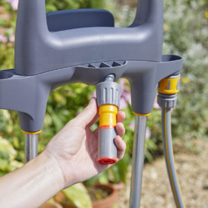 Rozłóż przednią nogę i zatrzaśnij ją, aby zapewnić stabilność podczas podlewania. Po zakończeniu złóż nogę ponownie, aby ułatwić przesuwanie i przechowywanie.