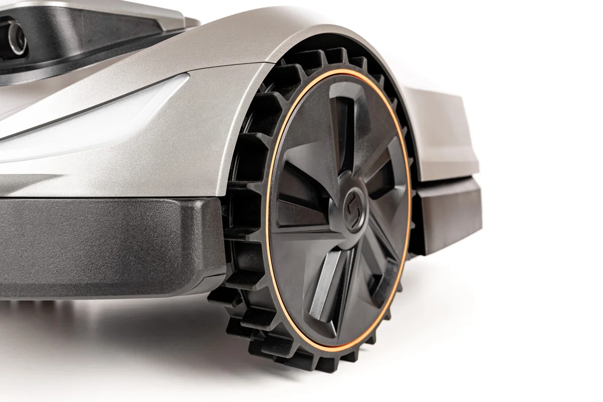 - ✔ Napęd na wszystkie koła (AWD) i opony terenowe umożliwiają pokonywanie nachyleń do 60% (30°), co czyni robota niezawodnym również w wymagających ogrodach.