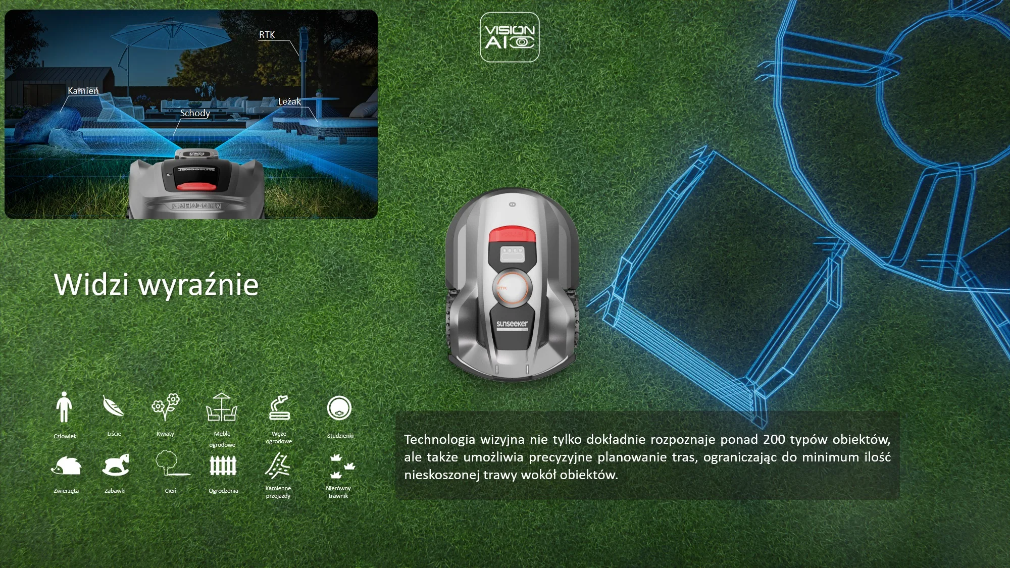 - ✔ System Vision AI rozpoznaje i omija ponad 150 rodzajów przeszkód.