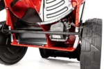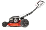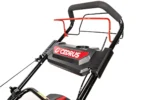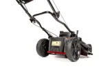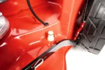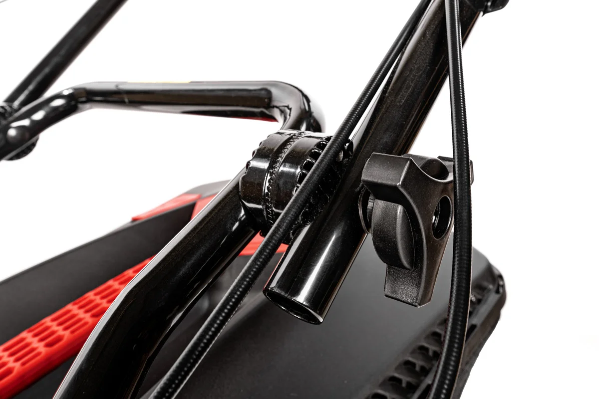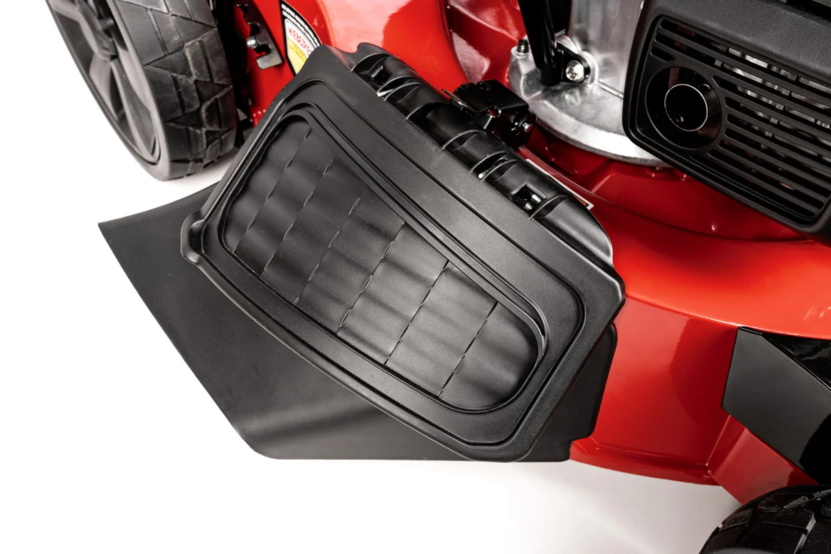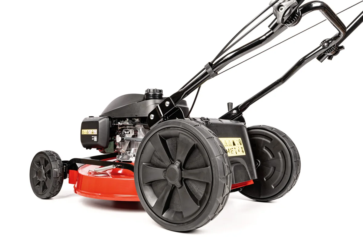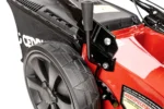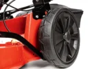 Napęd oparty o pasek klinowy efektywnie przekazuje moc z silnika, gwarantując płynne poruszanie się nawet po nierównym terenie. Duże tylne koła (11 cali) oraz przednie (8 cali) z łożyskami kulkowymi zapewniają stabilność, przyczepność i łatwe manewrowanie. Nawet na miękkim, wilgotnym podłożu kosiarka porusza się bez oporu, a specjalnie zaprojektowany bieżnik dba o pełną kontrolę.