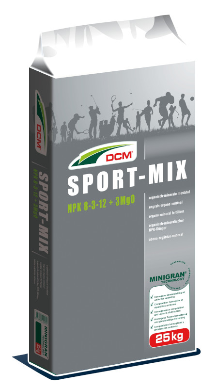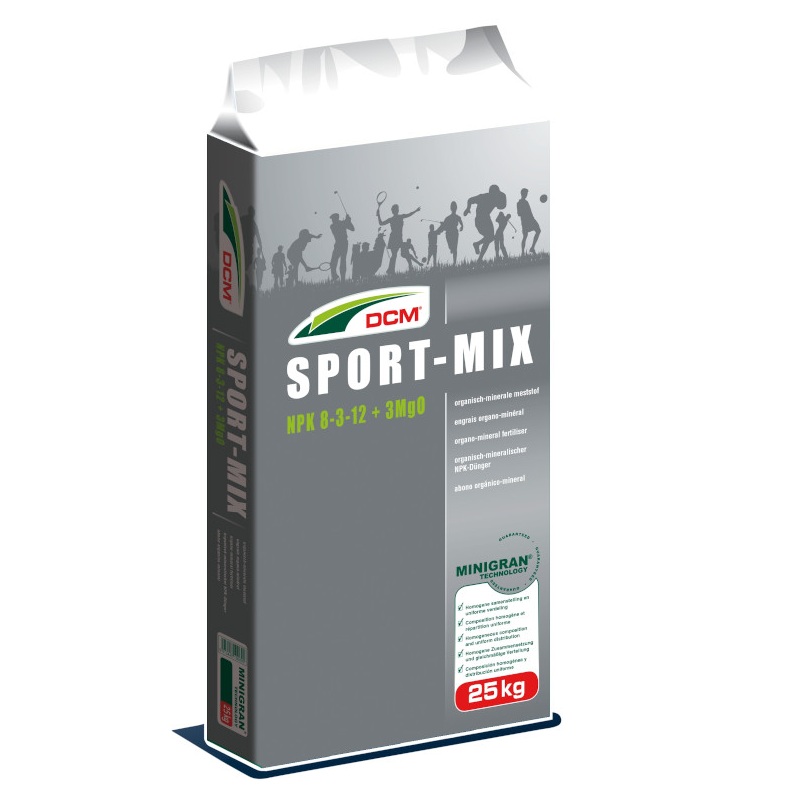DCM Sport-Mix 8-3-12 + 3 MgO to organiczno-mineralny nawóz klasy premium, stworzony specjalnie dla intensywnie użytkowanych trawników sportowych, rekreacyjnych oraz ozdobnych. Dzięki unikalnej technologii MINIGRAN®, nawóz działa precyzyjnie, skutecznie i bez ryzyka przenawożenia.