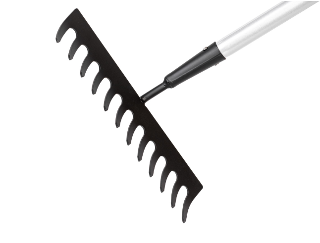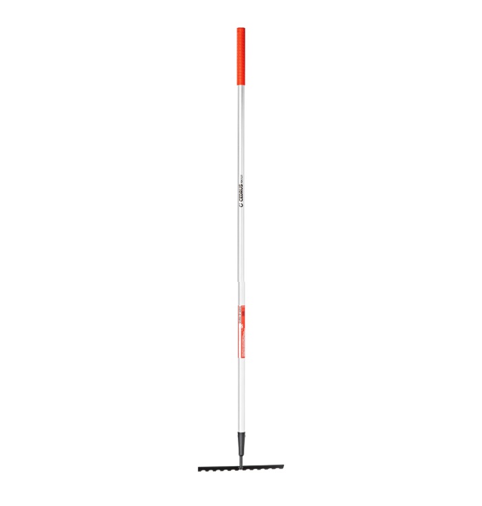 Szeroka głowica 300 mm z wytrzymałymi zębami umożliwia szybkie i dokładne wyrównywanie ziemi oraz zbieranie resztek roślinnych. Lekki trzonek aluminiowy ułatwia pracę, a miękki uchwyt antypoślizgowy TPR zapewnia wygodny i pewny chwyt.