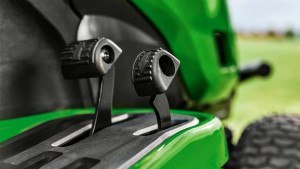 Napęd hydrostatyczny Kanzaki® Tuff Torq® zapewnia bezstopniową regulację prędkości jazdy i ułatwia zmianę kierunku jazdy: Pedały umieszczone obok siebie umożliwiają kontrolowanie prędkości i kierunku jazdy: