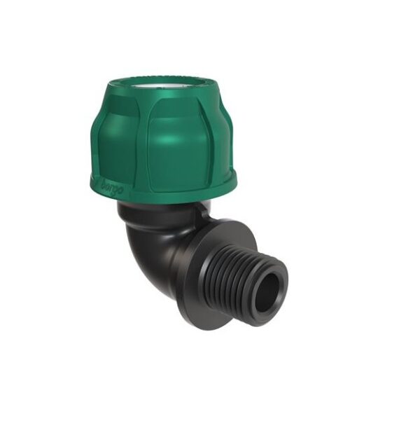 Kolano PE M (GZ) 25 mm – 3/4″ PN10 marki Bergo to funkcjonalna kształtka instalacyjna przeznaczona do łączenia rur polietylenowych z elementami wyposażonymi w gwint wewnętrzny. Umożliwia zmianę kierunku przepływu pod kątem 90° oraz szybkie przejście z instalacji PE na połączenie gwintowane 3/4″. Dzięki konstrukcji skręcanej (kompresyjnej) montaż jest szybki i nie wymaga specjalistycznych narzędzi, a połączenie pozostaje szczelne i trwałe. Wysokiej jakości tworzywo zapewnia odporność na korozję, promieniowanie UV oraz działanie chemikaliów, co gwarantuje długą żywotność i niezawodność w instalacjach wodnych i systemach nawadniania.