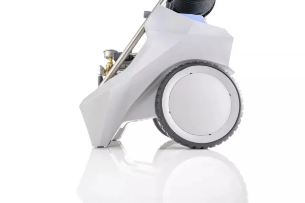 Myjka opiera się na jednoczęściowym podwoziu Roto-Mold wykonanym metodą formowania rotacyjnego. Dzięki temu konstrukcja wykazuje wysoką odporność na uszkodzenia mechaniczne. Co więcej, urządzenie zachowuje stabilność nawet w trudnych warunkach. Duże, gumowe koła oraz nisko położony środek ciężkości ułatwiają manewrowanie. Z tego powodu możesz bez problemu przemieszczać się po błotnistym, piaszczystym lub nierównym terenie.