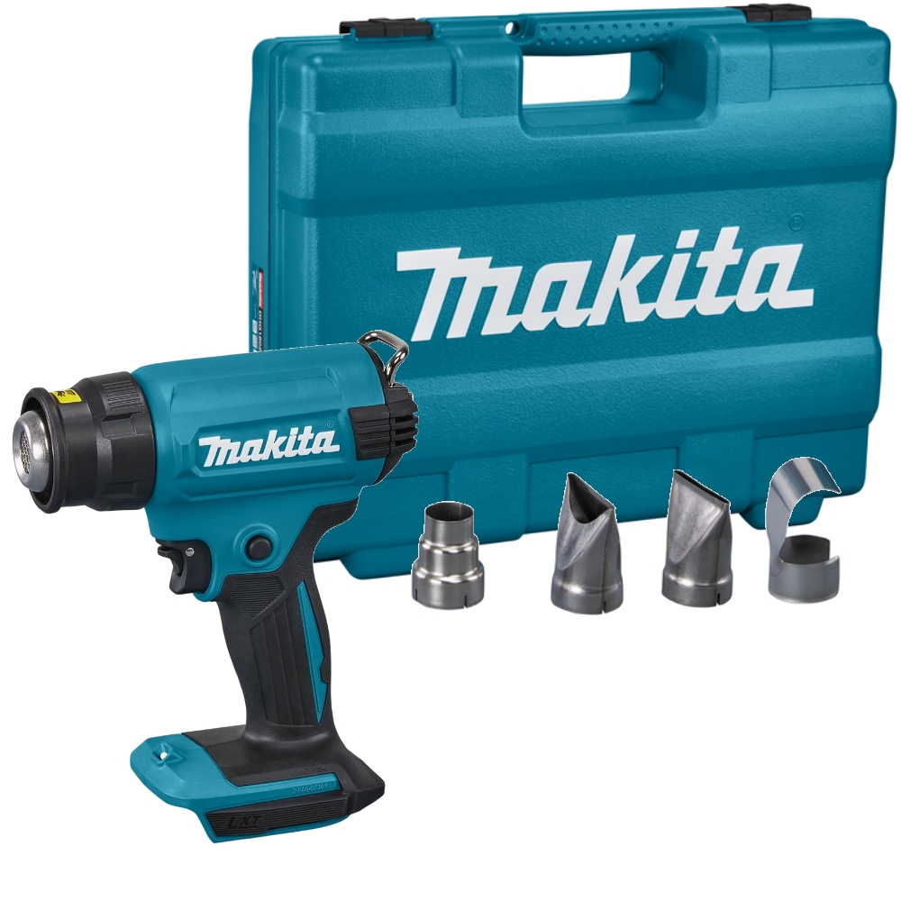 Model DHG180ZK w swoim wyposażeniu oferuje cztery wymienne dysze poszerzające zakres zastosowań. Do kolejnych zalet tego urządzenia należy zaliczyć gumowany miękki uchwyt zapewniający większy komfort podczas pracy. Ponadto narzędzie to oferuje stałą temperaturę 550°C oraz stały przepływ powietrza wynoszący 200 L/min. Kompaktowa i ergonomiczna opalarka akumulatorowa Makita DHG180ZK posiada również specjalny hak do zawieszenia narzędzia oraz blokadę włącznika chroniącą przed przypadkowym uruchomieniem.