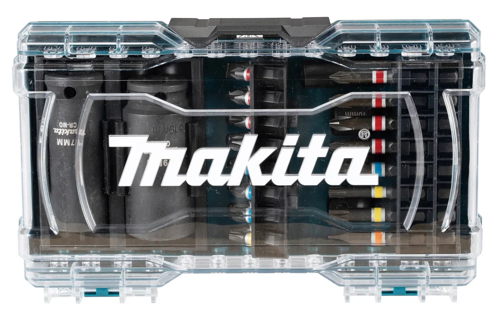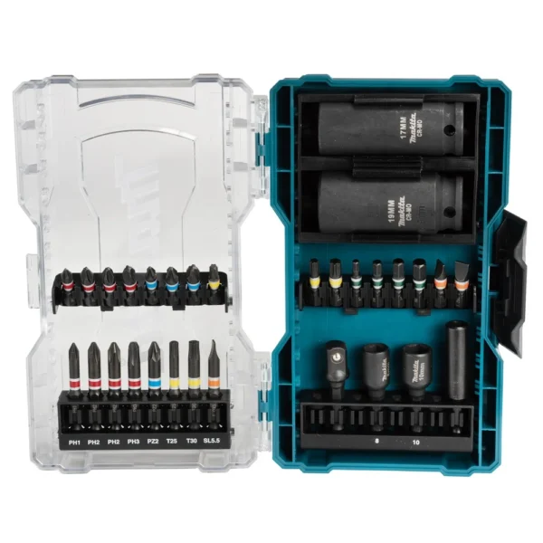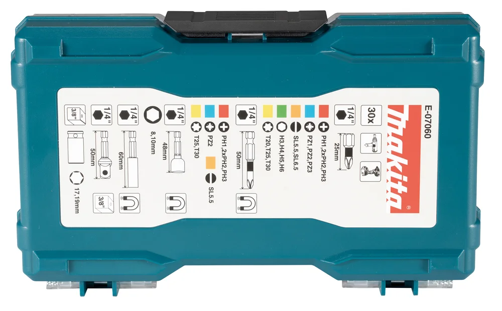 I Makita E-07060 zestaw zawierający 24 końcówki wkrętakowe 50 mm oraz 25 mm, 2 nasadki 3/8″, adapter nasadki 3/8″ i 2 nasadki udarowe.