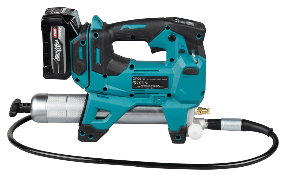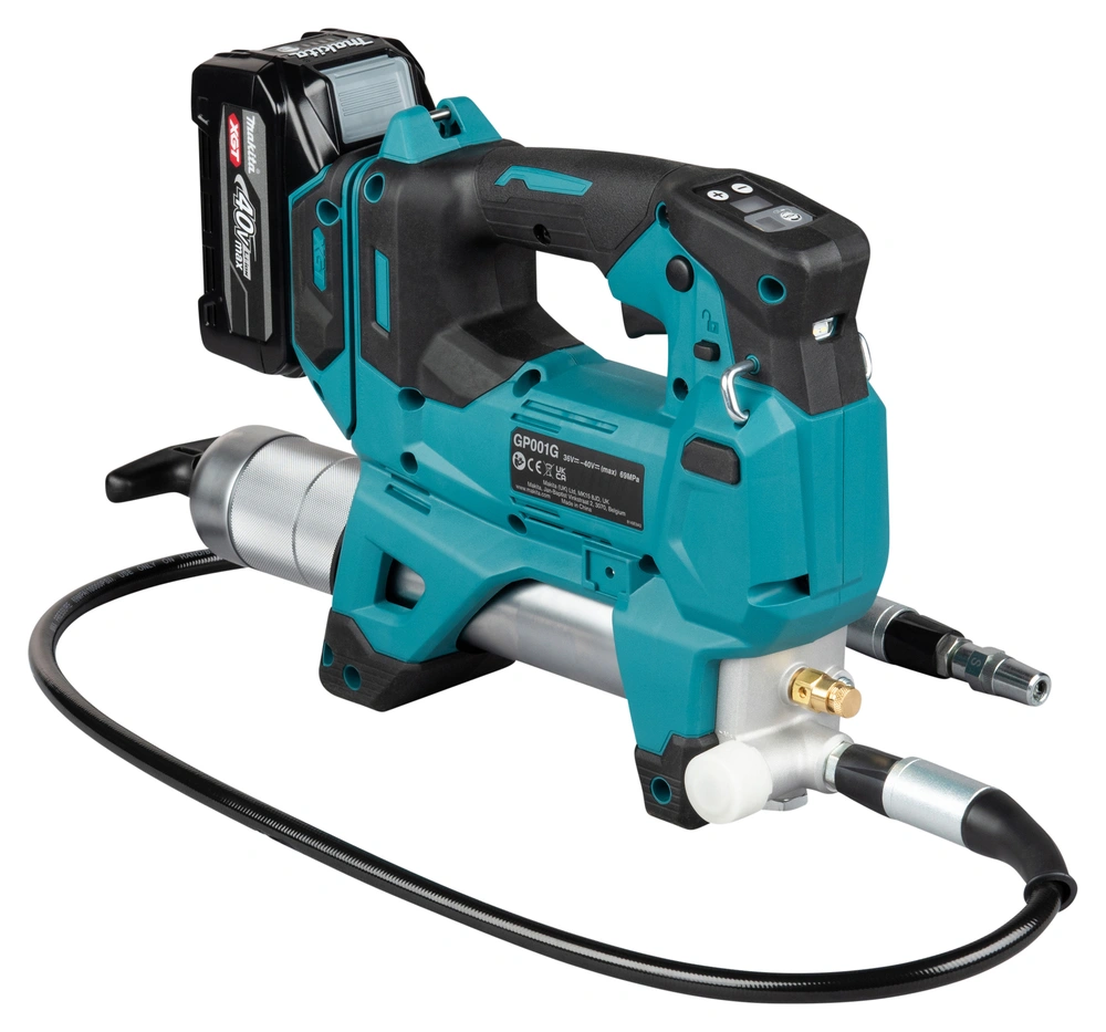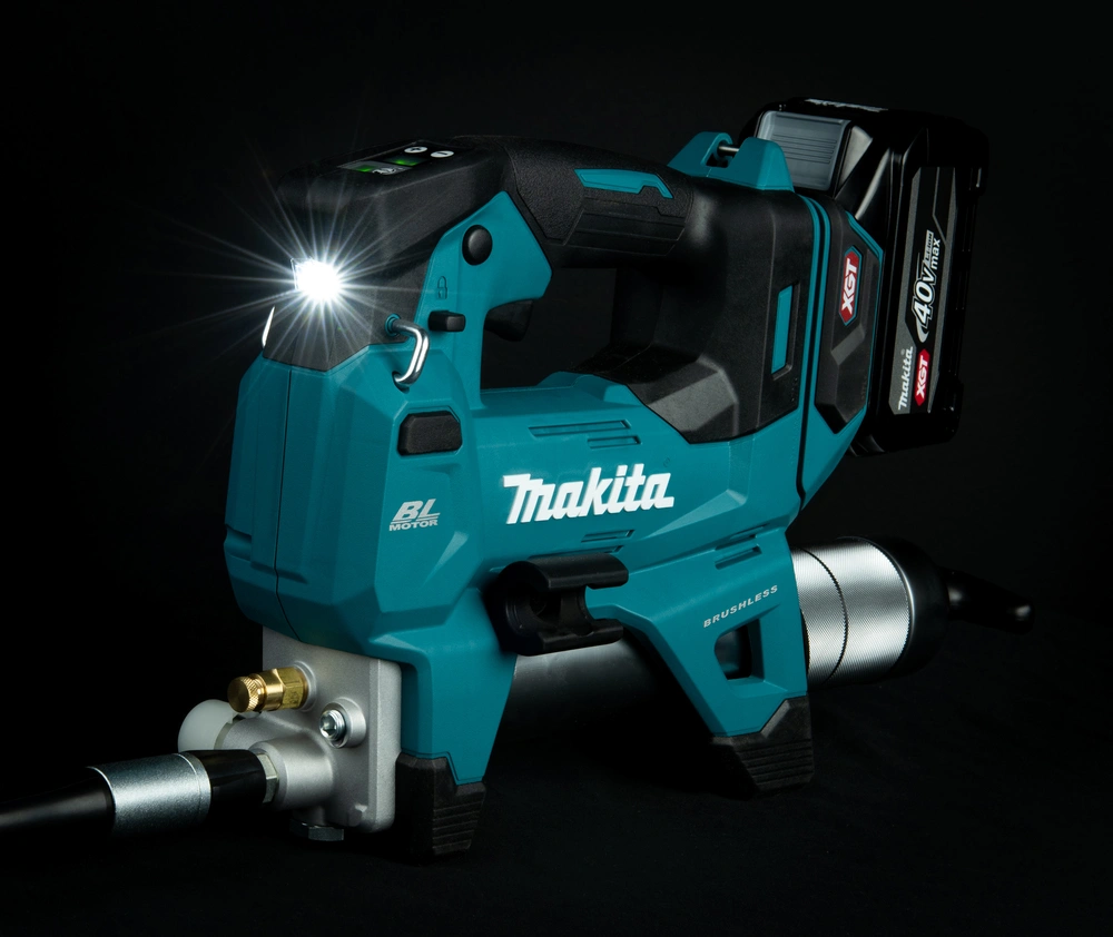 Makita GP001GZ to akumulatorowa smarownica z systemu XGT 40V max, wyposażona w bezszczotkowy silnik BLDC, maksymalne ciśnienie robocze 69 MPa / 690 bar, 4 tryby przepływu do 350 ml/min, a także wyświetlacz LED i funkcję ustawiania liczby skoków do automatycznego zatrzymania narzędzia.