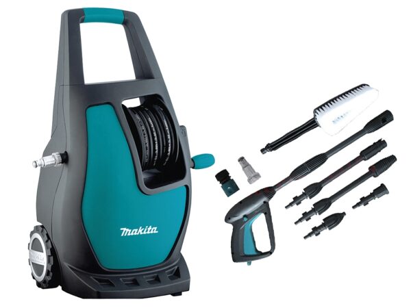 Niezawodna myjka wysokociśnieniowa Makita HW111, to kompaktowe i lekkie urządzenie przystosowana do prac wokół domu i mycia samochodu. Urządzenie to wyposażone zostało w mimośrodową pompę trójtłokową z indukcyjnym silnikiem szczotkowym i wymiennym filtrem wody. Silnik ten posiada moc 1700 W i zapewnia maksymalne ciśnienie 110 barów przy przepływie 370 litrów na godzinę. Dzięki tej mocy nawet najbardziej zeschnięty tłuszcz, brud i pleść nie będą miały żadnych szans. Myjka HW111 japońskiej firmy Makita posiada również automatyczny zawór bezpieczeństwa z systemem by-pass, a także system Total Stop umożliwiający automatyczne uruchamianie i zatrzymywanie.