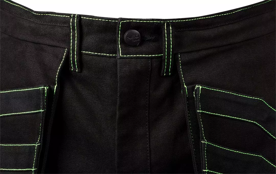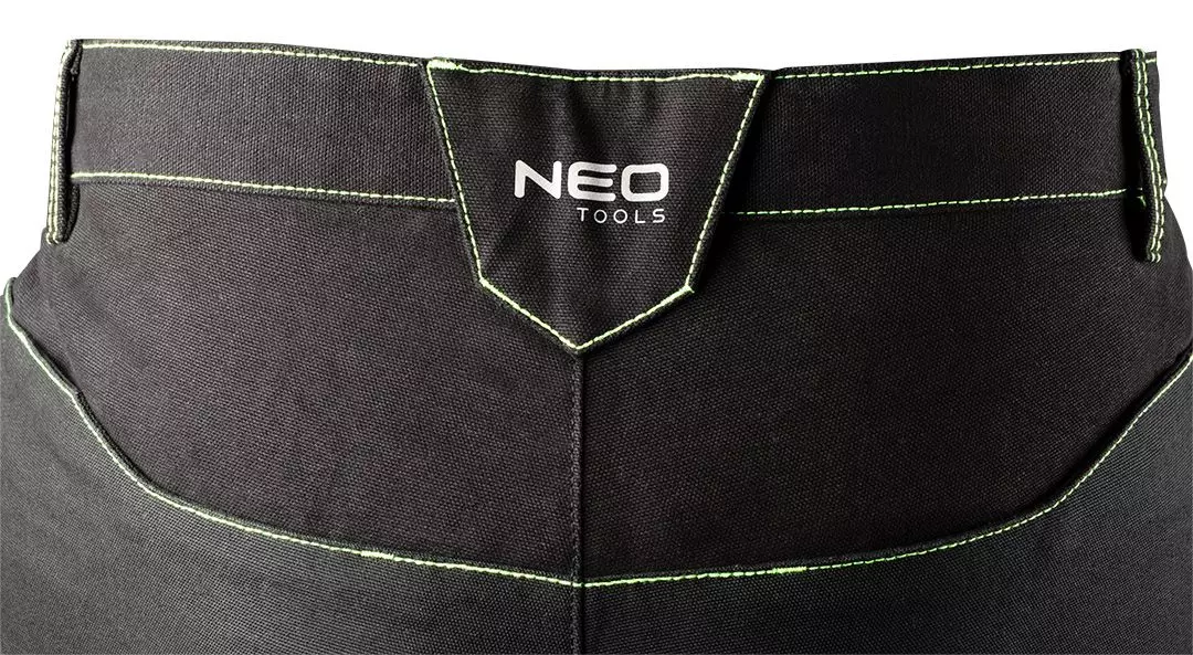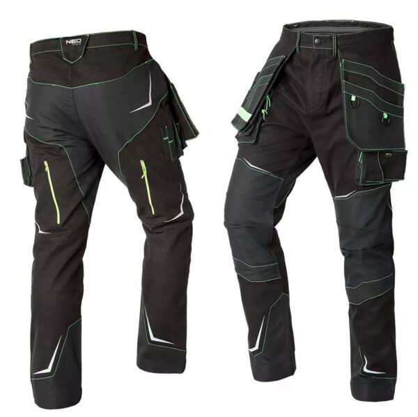NEO Spodnie Robocze Premium PRO — wytrzymałe spodnie dla profesjonalistów, z wzmocnieniami i elastycznymi panelami, zapewniające komfort nawet podczas intensywnej pracy.