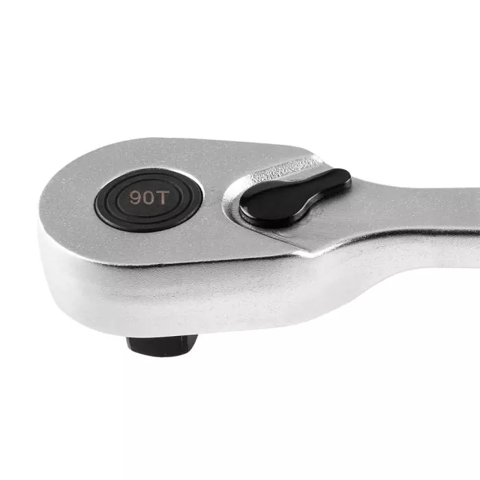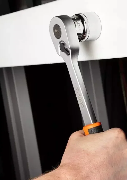 90-zębowy mechanizm zapadkowy z samoklinującą konstrukcją zapewnia nie tylko wyjątkową trwałość, ale również cichą i płynną pracę. Dzięki skokowi wynoszącemu zaledwie 4°, możliwe jest wygodne manewrowanie w ciasnych przestrzeniach, takich jak komora silnika, podwozie czy przy precyzyjnych połączeniach – bez kompromisów.