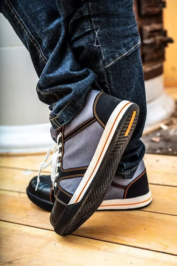 Model 82-11 został wyposażony w solidny metalowy podnosek, który chroni palce przed uderzeniami o energii do 200 J, a także w wzmocnienie tylnej części wykonane z trwałego tworzywa. Dzięki temu stopy są zabezpieczone zarówno od frontu, jak i od strony pięty, co znacząco zwiększa bezpieczeństwo podczas pracy. To niezawodna ochrona w magazynie, warsztacie czy na hali produkcyjnej.