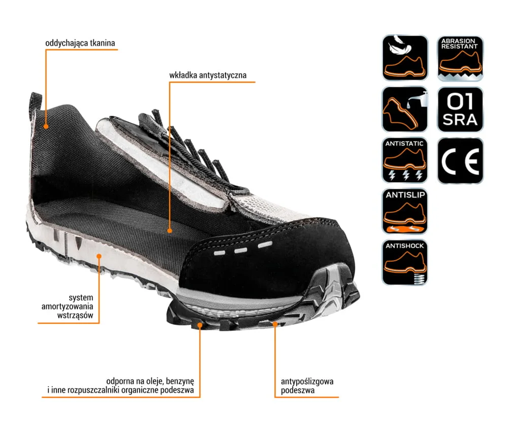 „description”: „Półbuty zawodowe NEO TOOLS 82-73 O1, metal free, dla mężczyzn. Całoroczne, lekkie, przewiewne, idealne do pracy w magazynach, halach produkcyjnych i warsztatach.”,