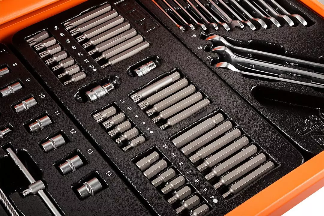 - ✔ Czytelne oznaczenia narzędzi ułatwiają szybkie odnalezienie potrzebnych elementów.