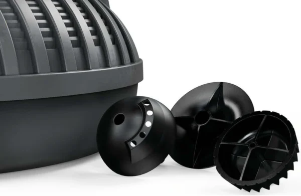 Pompa posiada dwa niezależne wyloty, które zwiększają jej funkcjonalność i możliwości aranżacyjne. Dzięki temu jeden zasila fontannę, a drugi może obsługiwać kaskady, strumienie lub dekoracyjne wylewki. Ponadto każdy wylot ma oddzielną regulację przepływu, co ułatwia dopasowanie intensywności pracy. Ochronny kosz zabezpiecza pompę przed zanieczyszczeniami, a szeroka podstawa gwarantuje stabilność nawet w głębszych zbiornikach. W rezultacie urządzenie działa płynnie, bezpiecznie i wyjątkowo niezawodnie.
