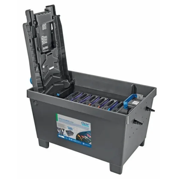 Podczas czyszczenia wykorzystasz odpływ na dole konstrukcji, dlatego łatwiej odprowadzisz zanieczyszczenia do kanalizacji. Ponieważ gąbki wyczyścisz bez wyjmowania, serwis przebiega szybciej i mniej brudzi. Specjalny wyciskacz ułatwia czyszczenie, a jednocześnie pomaga zachować sprawność wkładów. Co ważne, obudowa wzmocniona włóknem szklanym zwiększa odporność na warunki pracy. Dodatkowo możesz połączyć filtr z PhosLess, aby ograniczyć nadmiar składników odżywczych. Jeśli potrzebujesz mocniejszego wsparcia, podłącz lampę UVC Oase Bitron C lub Bitron Eco.