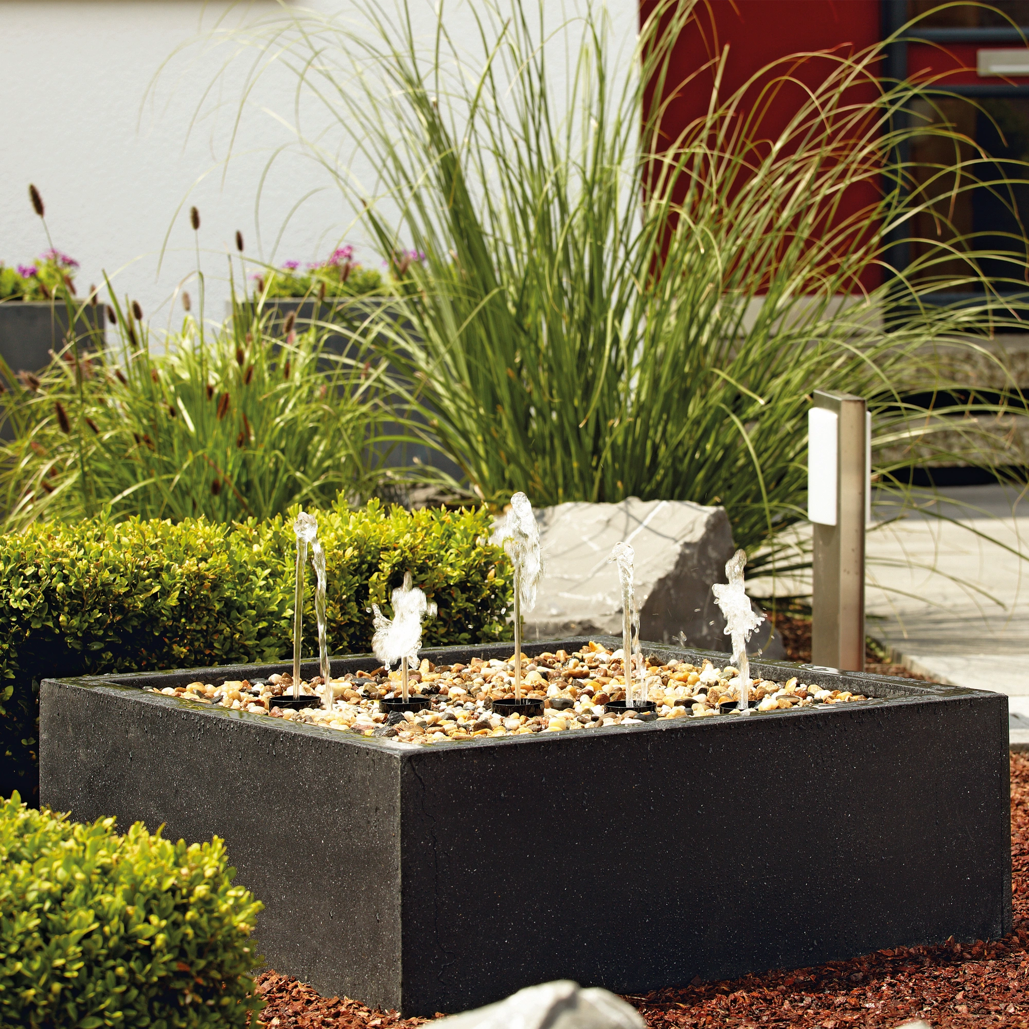 Każda z pięciu dysz generuje strumień wody o wysokości od 30 do 140 cm. Ponadto teleskopowa regulacja ułatwia dopasowanie zestawu do głębokości zbiornika. Co więcej, mechaniczna regulacja kąta nachylenia pozwala zmieniać układ fontanny. Dodatkowo użytkownik może tworzyć wzory od subtelnych po bardzo widowiskowe. Dzięki temu fontanna zawsze pasuje do charakteru aranżacji.