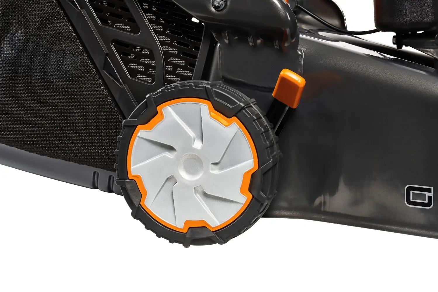 Koła na łożyskach kulkowych ułatwiają manewrowanie kosiarką i poprawiają komfort jazdy urządzenia po trawniku, szczególnie podczas częstego omijania przeszkód.