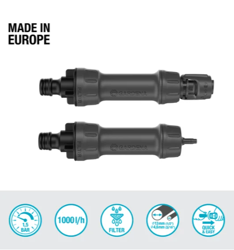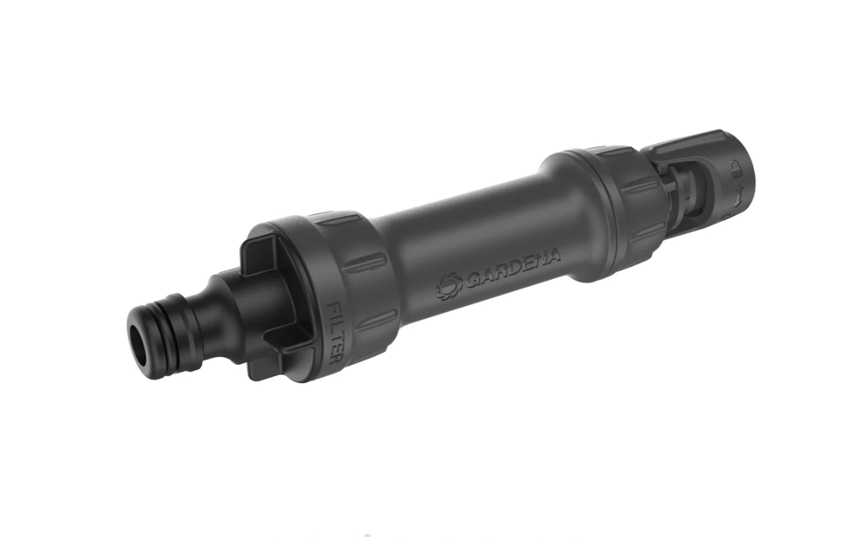 Zintegrowany filtr zapobiega zapychaniu się kroplowników i wydłuża żywotność systemu.