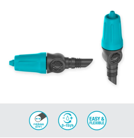 Regulowany kroplownik końcowy GARDENA 0–15 l/h to precyzyjne rozwiązanie do nawadniania pojedynczych roślin o zróżnicowanym zapotrzebowaniu na wodę. Idealnie sprawdzi się przy podlewaniu roślin doniczkowych, ziół, rabat oraz rzędów upraw w systemie Micro-Drip-System.