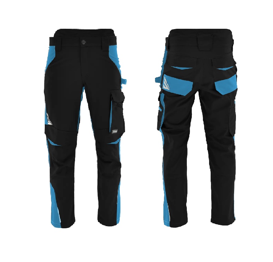 Ergonomiczny krój i wstawki z elastycznego materiału stretch gwarantują swobodę ruchów w każdej pozycji. Liczne kieszenie — w tym udowe, tylne z patkami oraz kieszenie na kolanach — zapewniają wygodne przechowywanie narzędzi.