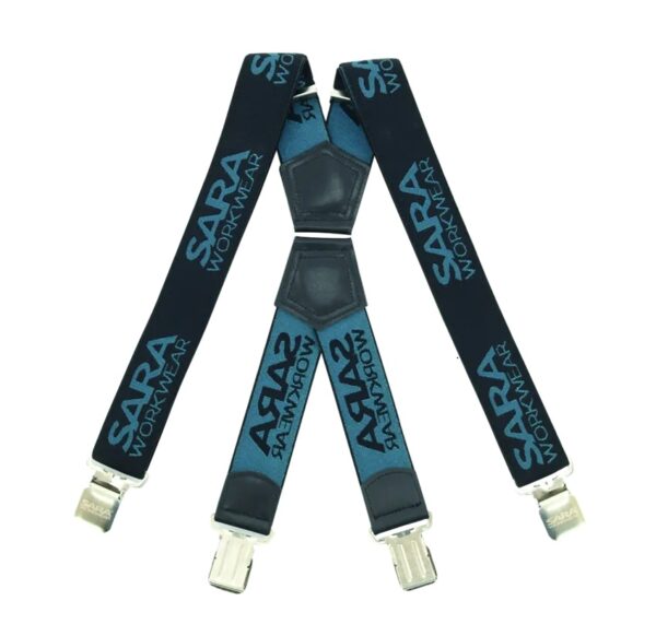 Wytrzymałe i elastyczne SARA Szelki typu „X” z metalowymi zaczepami, zapewniające wygodne i stabilne podtrzymanie spodni podczas pracy.