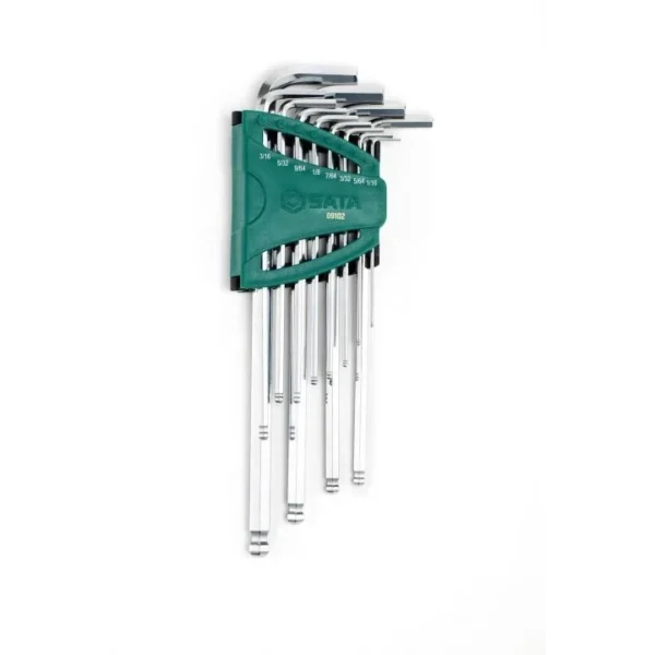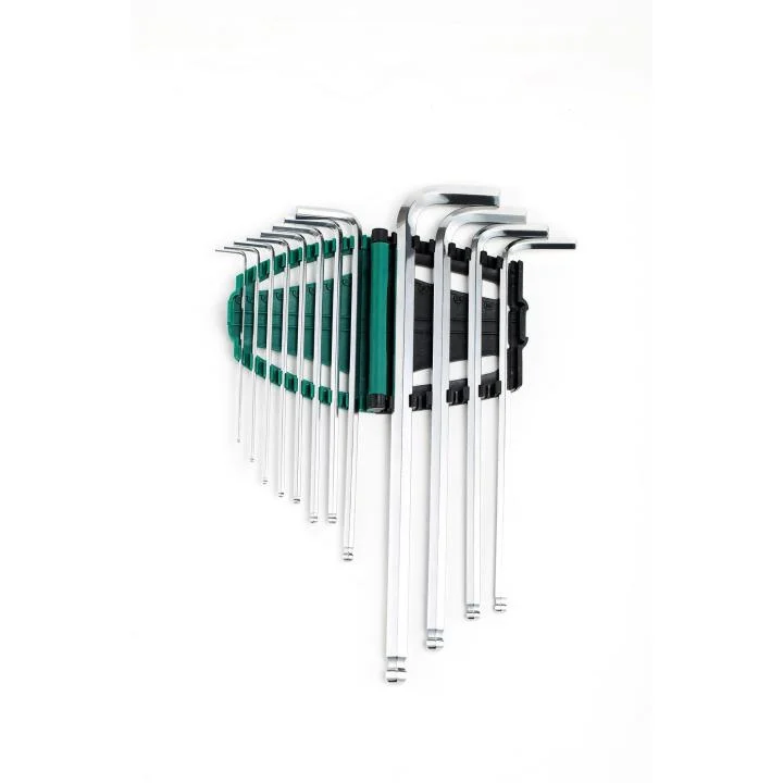 Każdy klucz w zestawie został wydłużony aż o 30%, co umożliwia łatwiejszy dostęp do trudno dostępnych śrub i zwiększa siłę dźwigni. Końcówki kulowe pozwalają na pracę pod kątem, co znacznie podnosi komfort i efektywność działania. Idealnie wyprofilowane trzpienie zapewniają pewny chwyt i szybkie dopasowanie do gniazda, a sfazowane końcówki ułatwiają precyzyjne wsunięcie narzędzia.