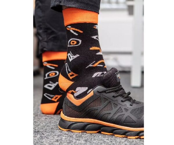 Połącz wygodę codziennego noszenia z kreatywnym akcentem, który wyróżni Cię w pracy i poza nią. Kolorowe skarpety NEO to propozycja dla każdego, kto ceni sobie oryginalny wygląd oraz praktyczne rozwiązania. Ich czarne tło przełamane pomarańczowo-szarym, narzędziowym patternem sprawia, że są świetnym dodatkiem dla majsterkowiczów i fanów nietuzinkowych wzorów 🔧✨.