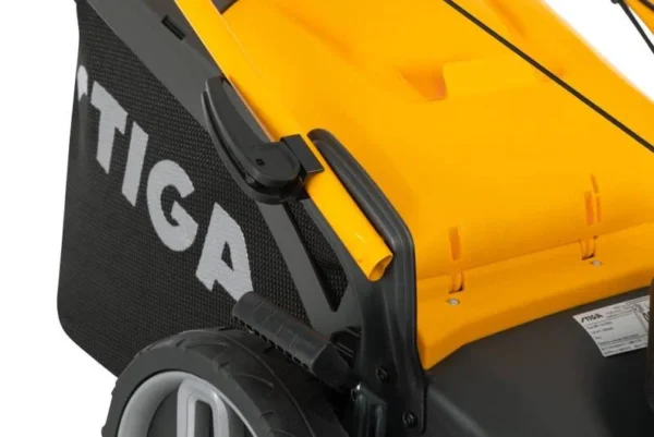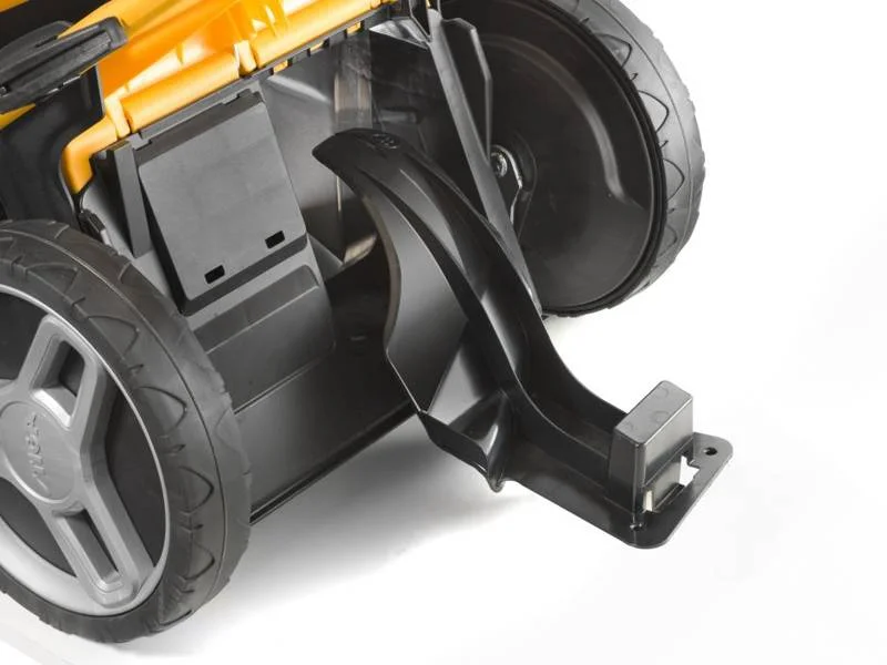 Ergonomiczna kierownica z miękkim uchwytem, którą można dostosować do wzrostu użytkownika, zapewnia wygodę pracy. Po zakończeniu koszenia kierownicę można łatwo złożyć, co oszczędza miejsce podczas przechowywania. Kosiarka wyposażona jest również w duże koła z miękkim bieżnikiem na łożyskach kulkowych, co ułatwia manewrowanie nawet na nierównym terenie. Praktyczny uchwyt z przodu kosiarki umożliwia szybki i łatwy transport.