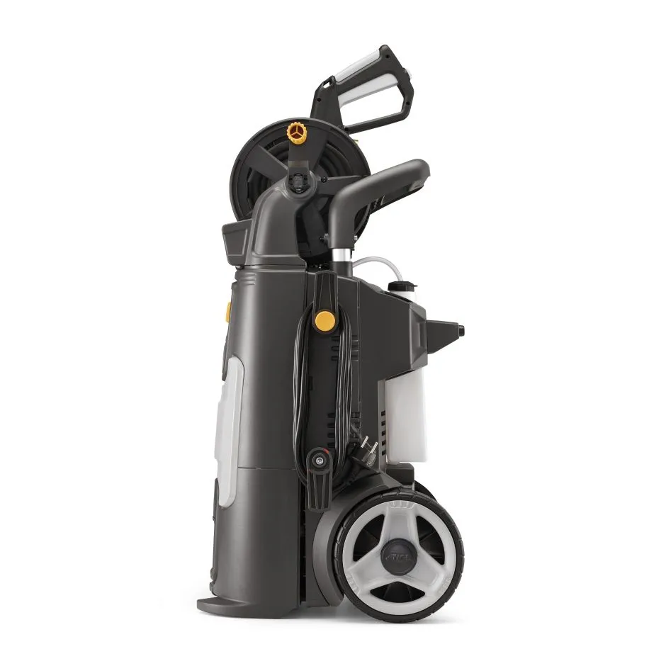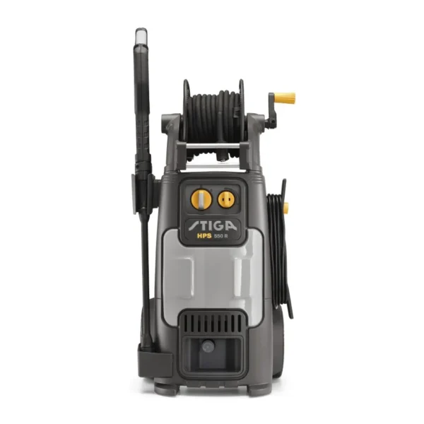STIGA HPS 550 R to nie tylko wydajność, ale także komfort. Myjka została wyposażona w 10-metrowy wzmocniony stalą wąż, który można łatwo nawinąć na bęben z aluminiowymi prowadnicami. Dzięki temu masz pełną swobodę ruchu, a po pracy łatwo przechowasz sprzęt. Duże, gumowe koła o średnicy 200 mm i teleskopowy uchwyt z miękkim wykończeniem zapewniają doskonałą manewrowość na każdym terenie.