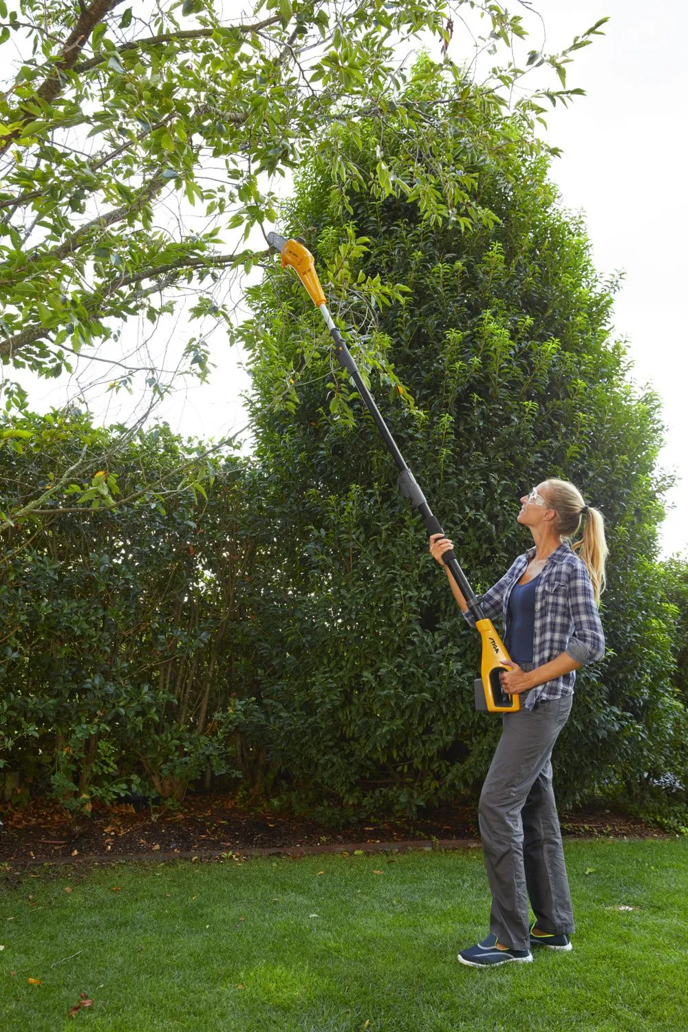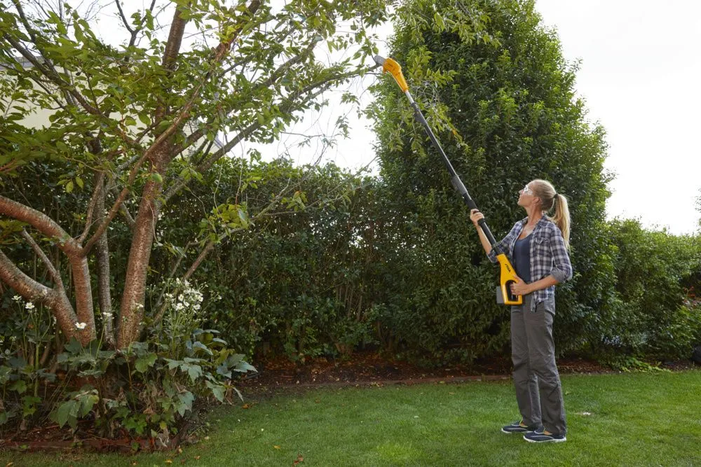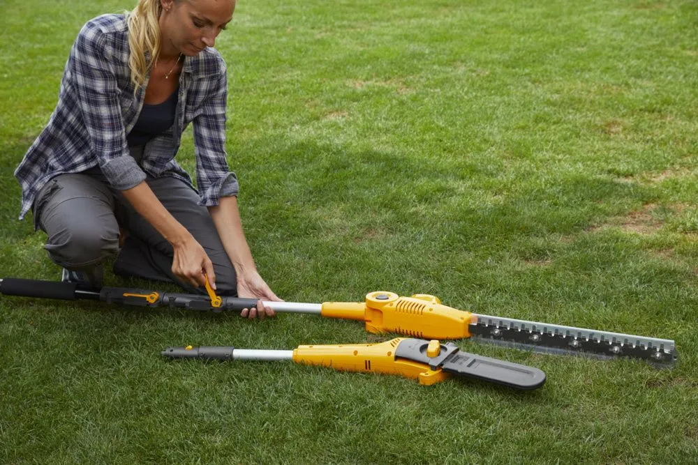 I Wszechstronne narzędzie – akumulatorowa podkrzesywarka i sekator w jednym, idealne do przycinania żywopłotów, krzewów i wysokich drzew.