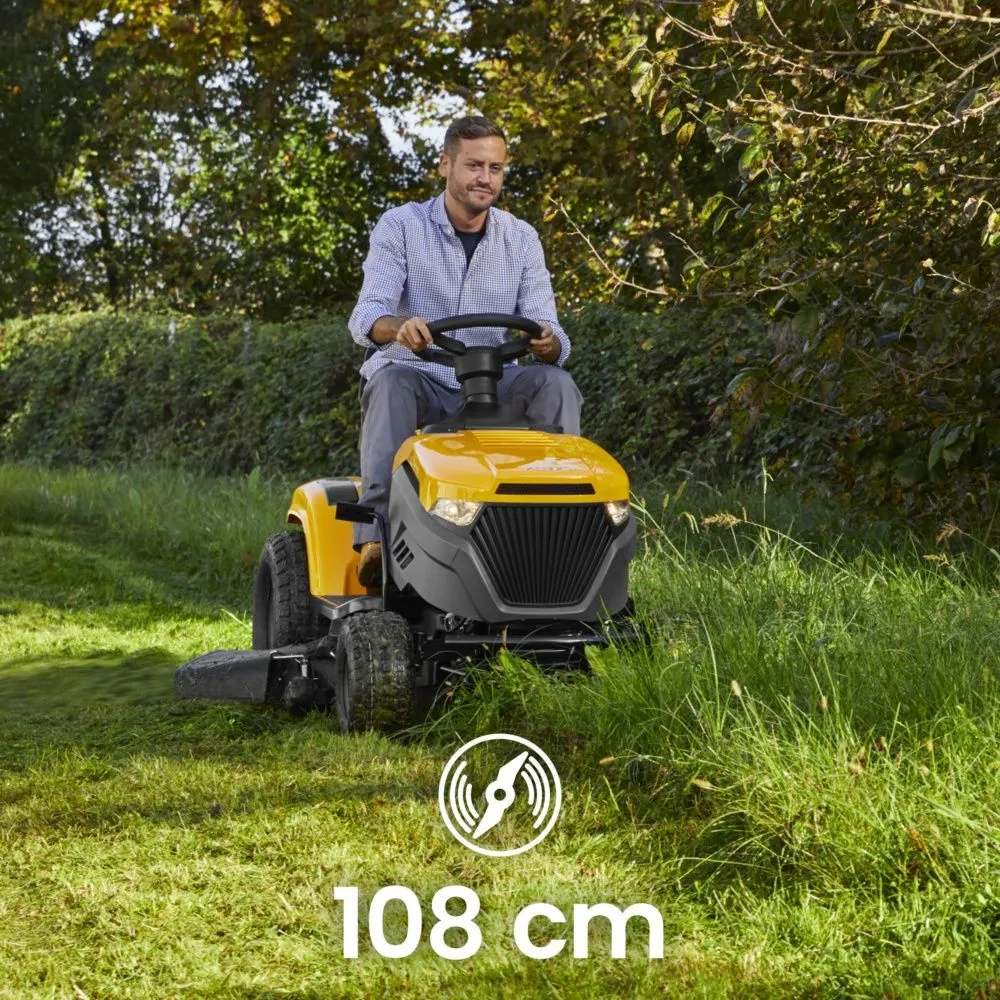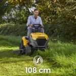 Szerokość koszenia 108 cm pozwala ograniczyć liczbę przejazdów i szybciej uporać się z większą powierzchnią. To bardzo dobry wybór dla osób, które nie chcą tracić czasu na wielokrotne koszenie wąskim urządzeniem.