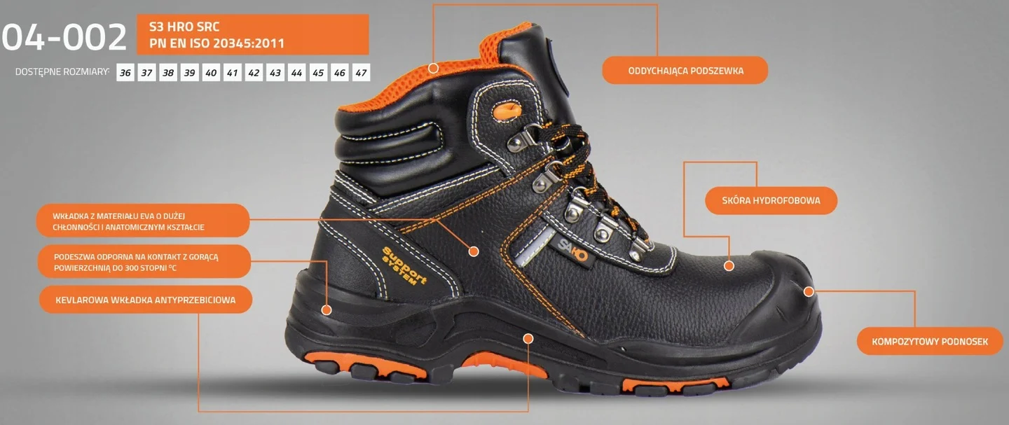 Model ten spełnia normę PN EN ISO 20345:2011, co czyni go idealnym wyborem dla branż takich jak przemysł ciężki, budownictwo czy produkcja. Trzewiki SAKO 04-002 S3 HRO SRC to połączenie siły, trwałości i wygody, której możesz zaufać każdego dnia.