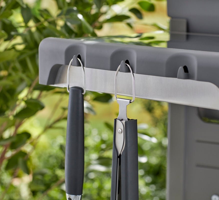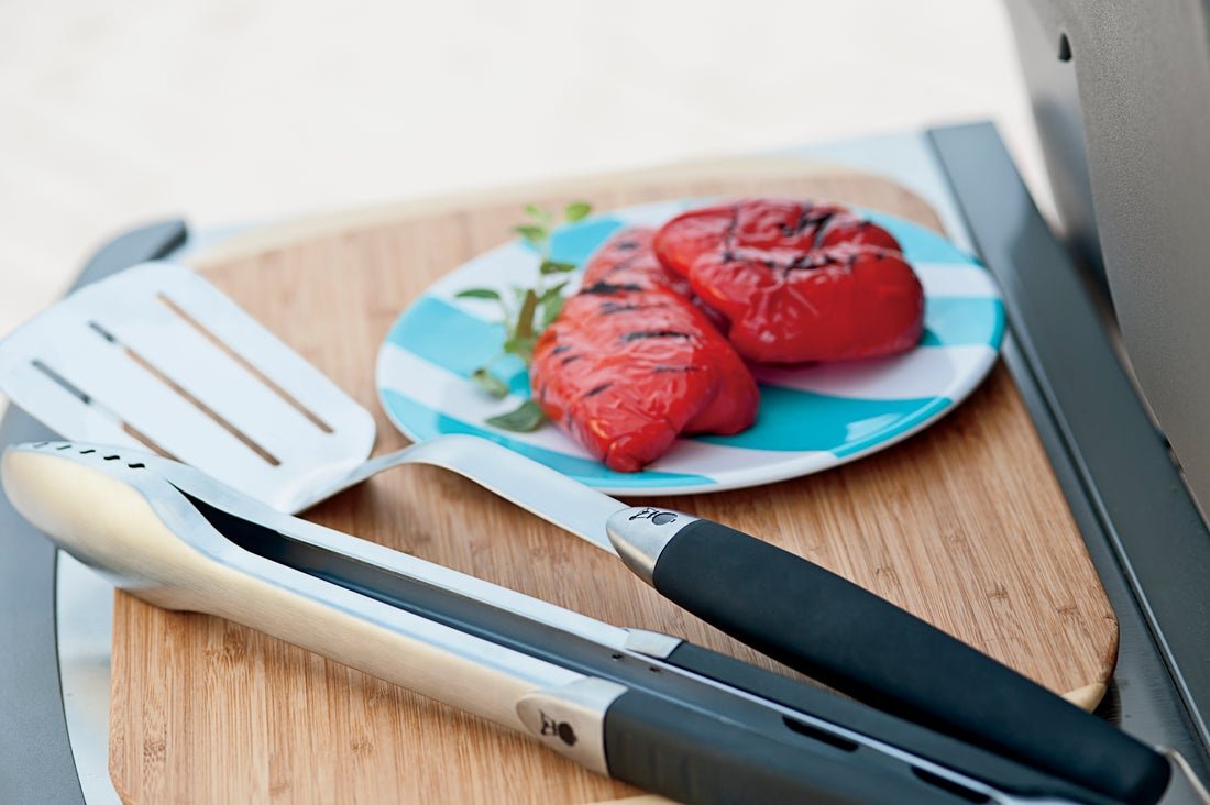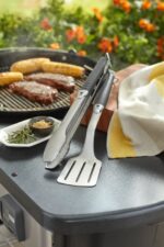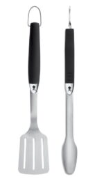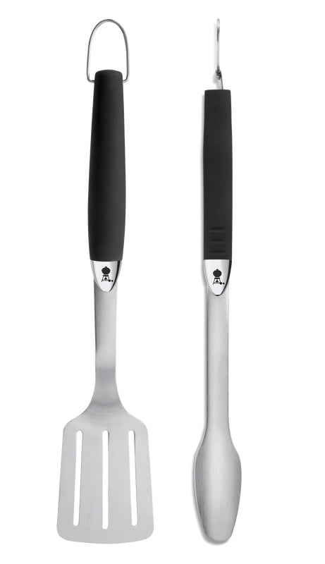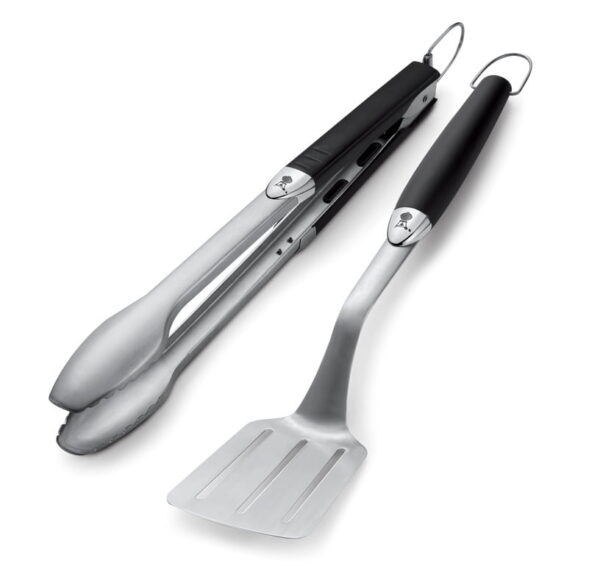 Wysokiej jakości dwuczęściowy zestaw długich narzedzi do grillowania Premium fachowej firmy Weber składający się ze szczypiec i szpatuły, to wyjątkowe akcesoria gwarantujące precyzyjną kontrolę i łatwość przemieszczania potraw. Każde akcesorium w tym zestawie posiada antypoślizgową, plastikową rączkę, która pewnie leży w dłoni. Ponadto wyprofilowana szyjka łopatki umożliwiają bezproblemowe podsuwanie oraz precyzyjne obracanie przygotowywanych potraw, natomiast bezdotykowy mechanizm blokujący w szczypcach stworzony został z myślą o łatwym użytkowaniu. Nadający się do mycia w zmywarce zestaw posiada dodatkowo pętelkę, która umożliwia zawieszenie i przechowywanie tych akcesoriów, np. na haczyku obok grilla.