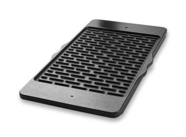Niezwykle wytrzymała dwustronna żeliwna patelnia grillowa pokryta wysokiej jakości emalią porcelanową, która jest bardzo łatwa do czyszczenia. Naczynie to rozgrzewa się szybko i równomiernie, dzięki czemu wszystkie potrawy smażą się równomiernie. Cechą wyróżniającą ten produkt jest, to że posiada on dwie strony: gładką do grillowania np. jajek i naleśników oraz stronę teksturowaną idealną do przygotowywania potraw mięsnych. Akcesorium to idealnie nada się do przygotowywania na grillu smakowitych potraw, takich jak: puszyste naleśniki, chrupiące placki ziemniaczane, pożywnych tostów francuskich czy skierczącego boczku.