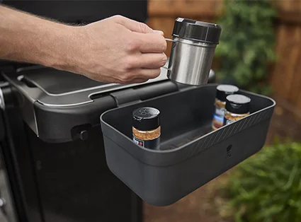 Zabudowany wózek z drzwiczkami umożliwia estetyczne i bezpieczne przechowywanie butli gazowej oraz akcesoriów grillowych. Lakierowane półki boczne oferują dodatkową przestrzeń roboczą, a cztery haczyki na akcesoria zapewniają porządek i łatwy dostęp do narzędzi.