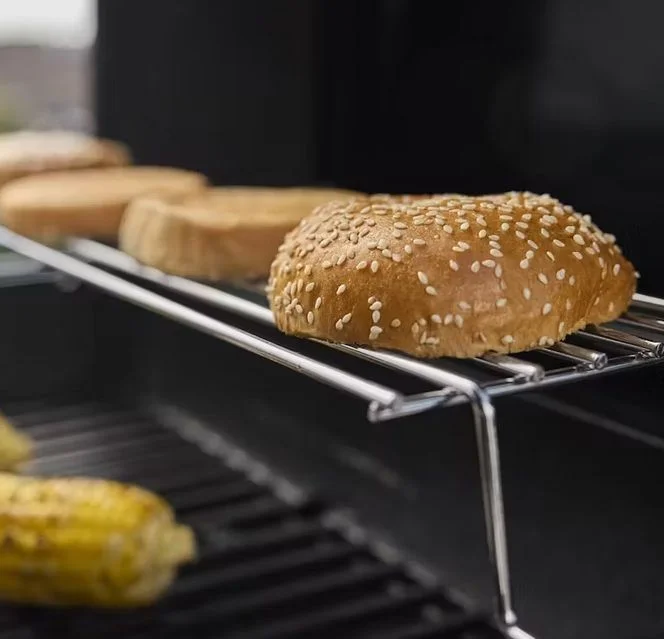 Powierzchnia grillowania o wielkości 2314 cm² z rusztem żeliwnym pokrytym emalią porcelanową 50/50 pozwala na przygotowanie posiłków dla około 6 osób. Dodatkowa półka do podgrzewania utrzymuje potrawy w idealnej temperaturze, co jest niezastąpione podczas spotkań towarzyskich.