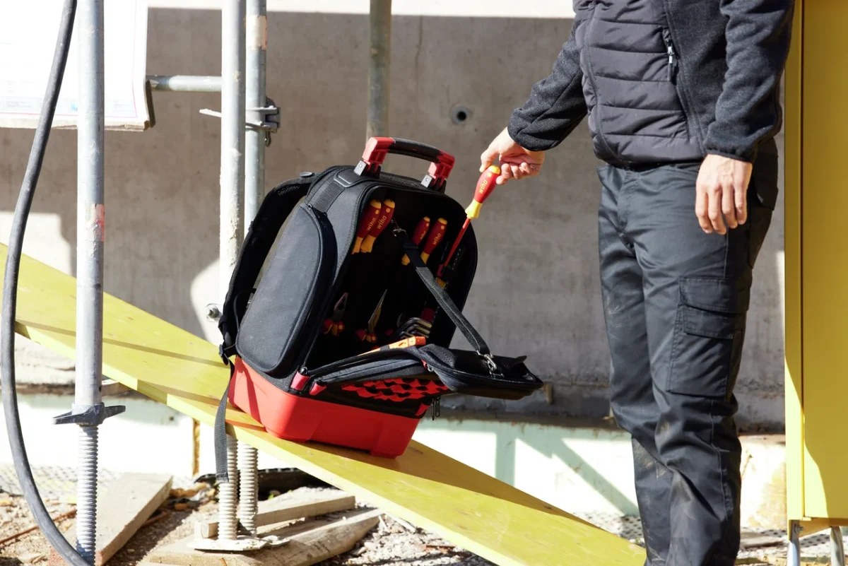 Plecak zawiera zestaw wysokiej jakości narzędzi, w tym izolowane szczypce, ergonomiczne wkrętaki, poziomicę, multitool oraz kompaktowy PocketMax®. Wchodzące w skład wyposażenia narzędzia posiadają certyfikację VDE, gwarantując bezpieczeństwo podczas pracy przy elementach pod napięciem.