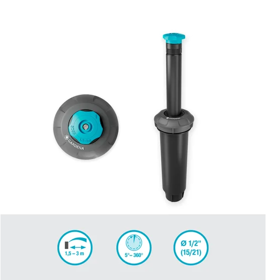 Zraszacz posiada gwint wewnętrzny 1/2″, dzięki czemu można go łatwo zintegrować z systemem GARDENA Sprinklersystem, w tym z linią S.