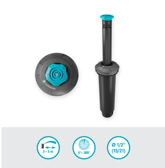 Pełna regulacja sektora nawadniania w zakresie od 5° do 360° oraz możliwość ustawienia zasięgu w przedziale 3–5 m pozwala idealnie dopasować pracę zraszacza do kształtu ogrodu.
