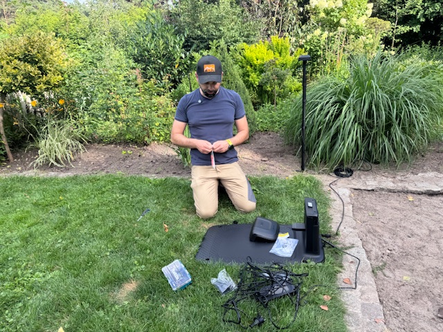 Kolejnym etapem było zamocowanie stacji referencyjnej. To właśnie ona łączy się z satelitami i odpowiada za precyzyjne pozycjonowanie robota w ogrodzie. Stację najlepiej umieścić w miejscu oddalonym od wysokich drzew, krzewów i budynków – dzięki temu nie będzie zakłóceń sygnału GPS. Po przymocowaniu do gruntu i połączeniu z bazą za pomocą dołączonego kabla, wszystko było gotowe do dalszej konfiguracji.